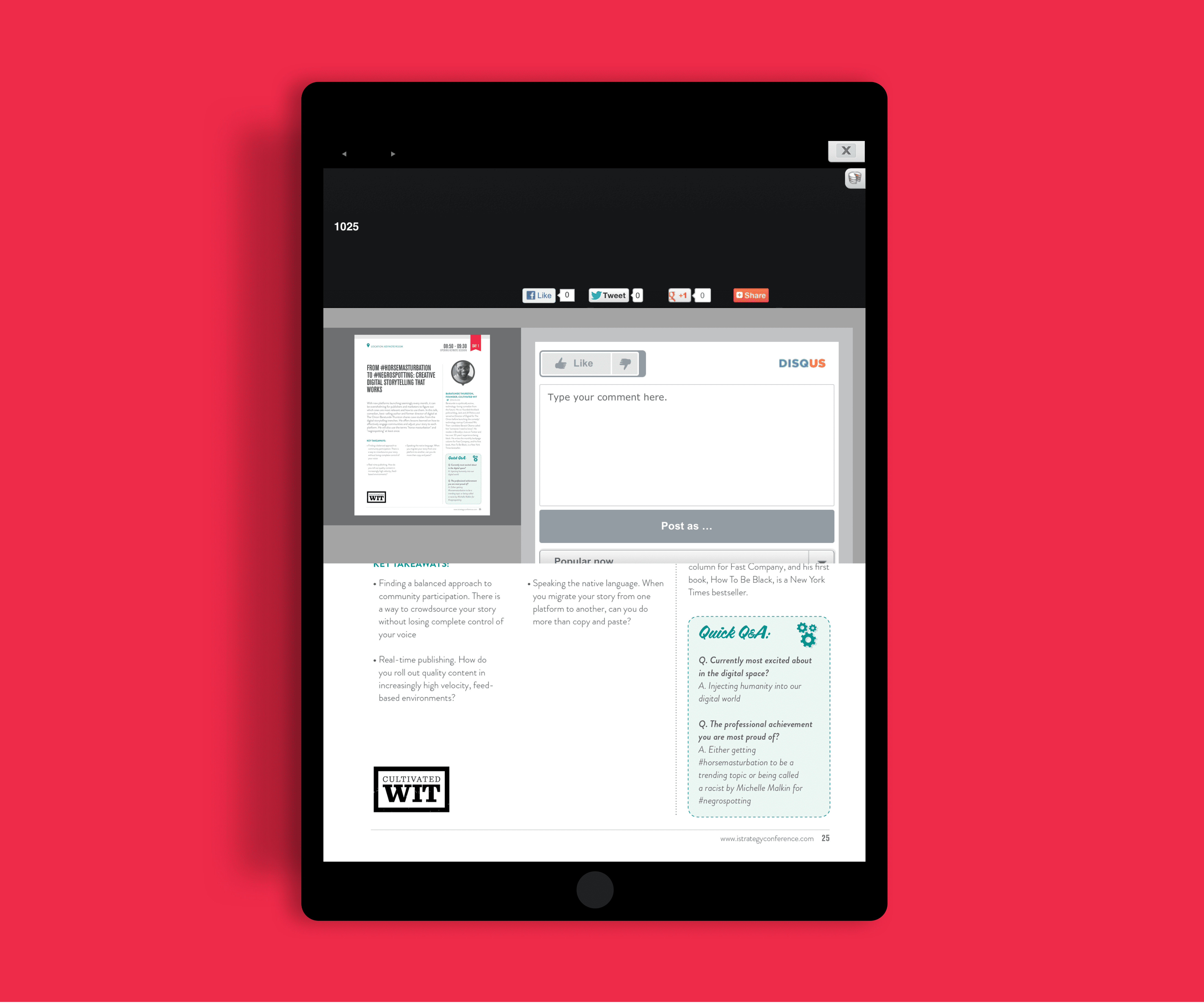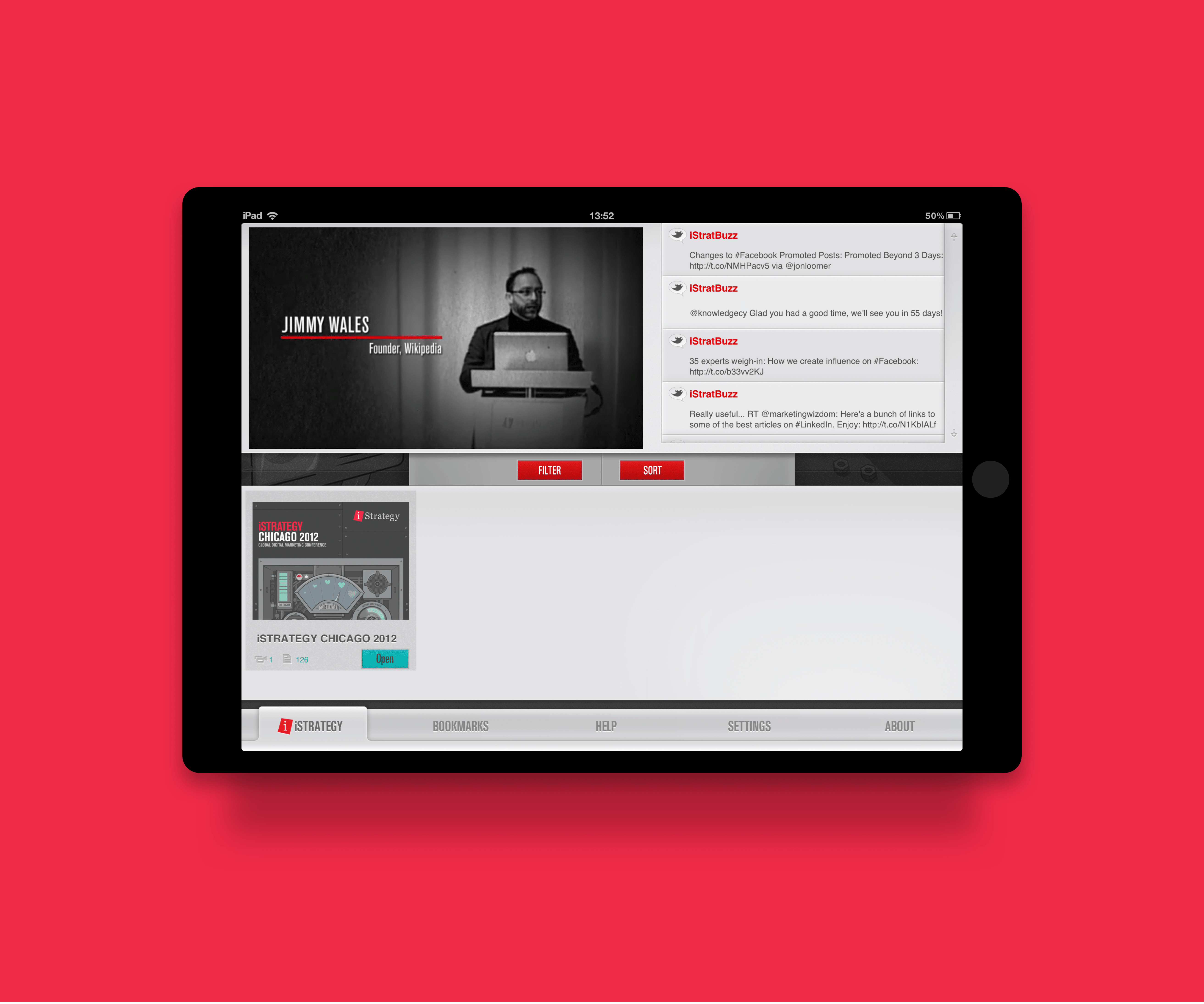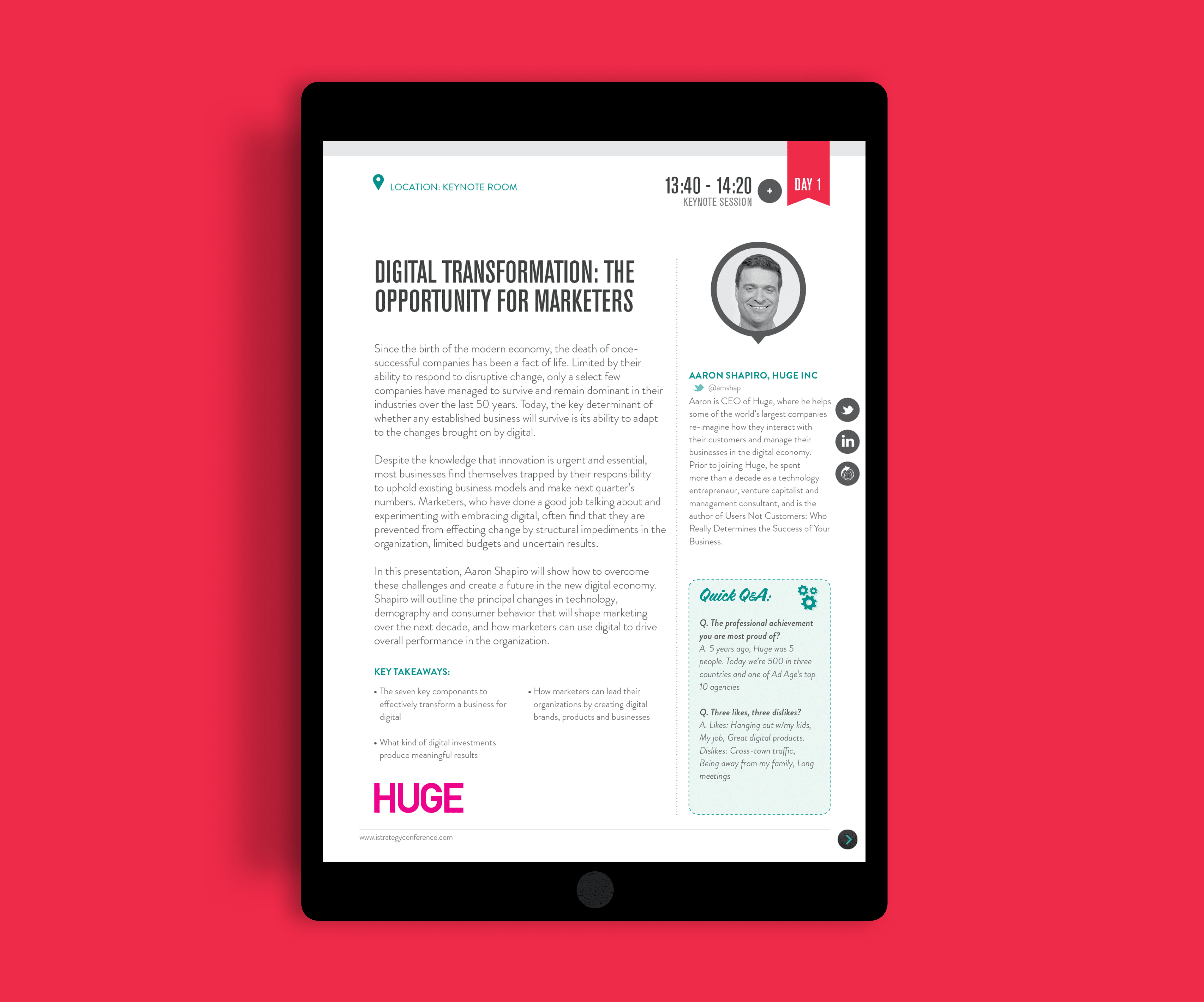 Attendees were able to download and view the entire conference program offline, add keynote sessions to their calendars, write notes on pages, see live iStrategy Twitter feed, watch videos, listen to audios, view keynote speaker LinkedIn and/or Twitter profiles, bookmark pages of interest and share pages with friends or colleagues, and were provided access to exclusive keynote presentation material behind a login.