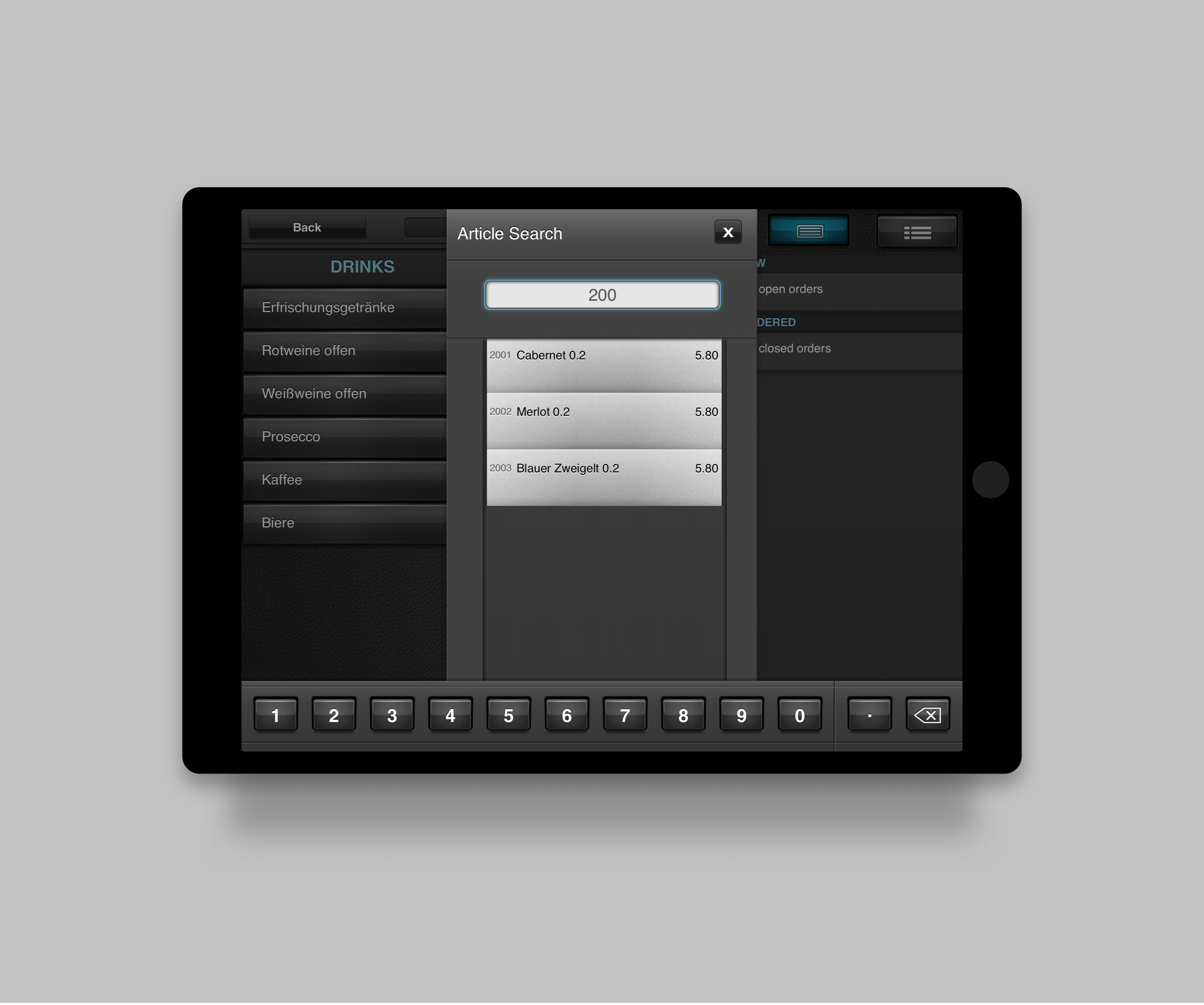 The iPad Mini was the master device which could also be used as a standalone cash register. The system extended to iPod Touches to cater for different gastronomy situations allowing for real-time syncing between all mobile ordering devices. The technology made it easy for an employee to take over another employees table without having to issue the bill.